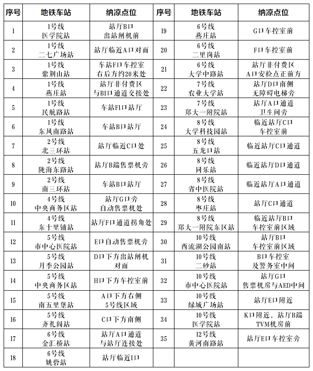 納涼點(diǎn)數(shù)量眾多且分布廣泛,不僅環(huán)境整潔、體感涼爽,還為市民提供了熱水、針線盒、雨衣、雨傘、充電寶等實(shí)用物品,滿足乘客的各種需求。納涼期間,如需使用衛(wèi)生間,可到車(chē)站客服中心領(lǐng)取“便民服務(wù)卡”,免費(fèi)進(jìn)站使用衛(wèi)生間。讓您在避暑納涼的同時(shí)感受到來(lái)自鄭州地鐵的關(guān)愛(ài)與溫暖。